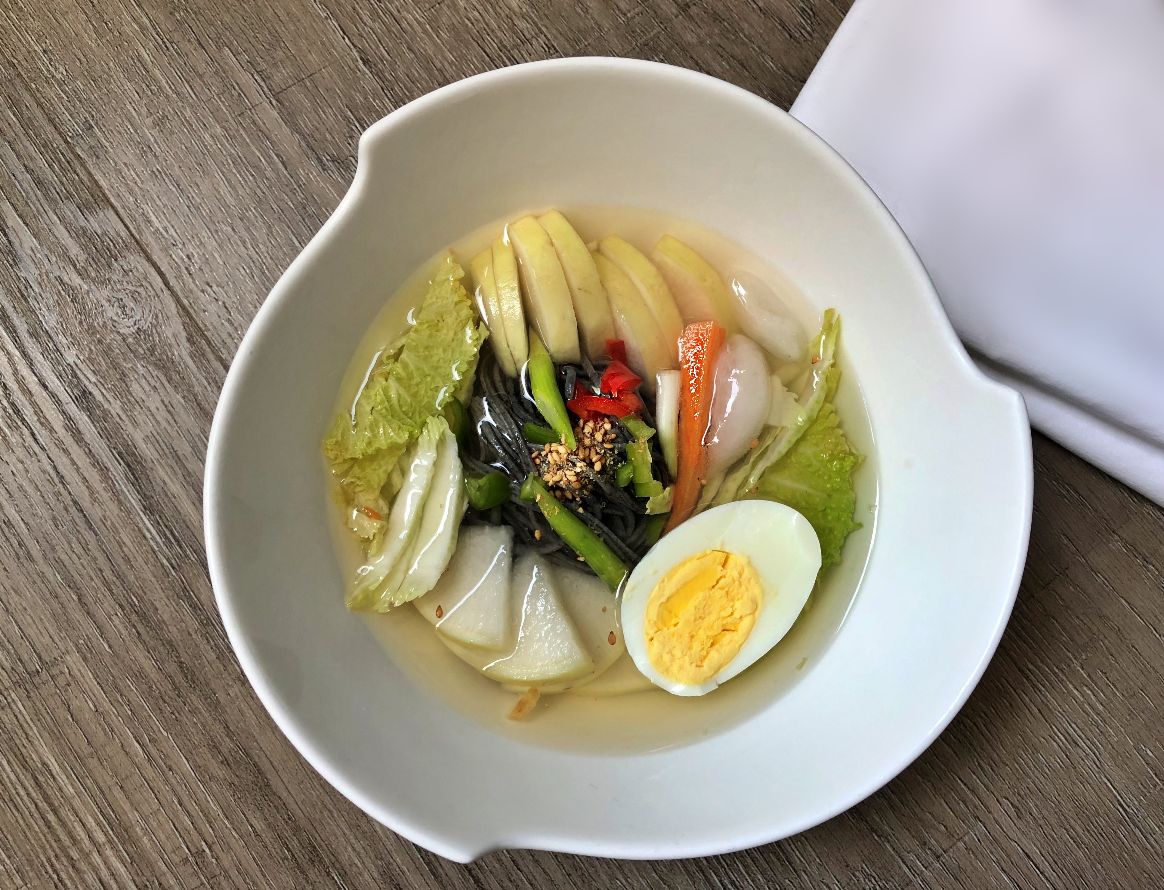 1- 대접에 삶은 검정 콩국수와 생수로 얼린 얼음을 담는다.