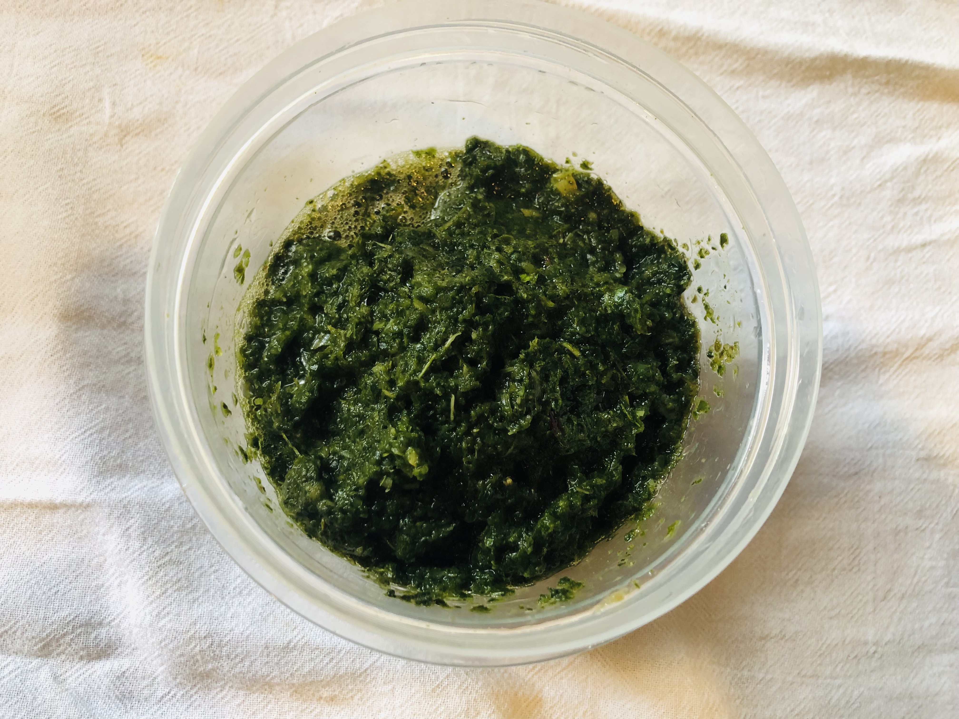 재료는 먼저 케일즙 짜고 남은 그린 채소 건지가 약 1컵 이내로 있어야 합니다.