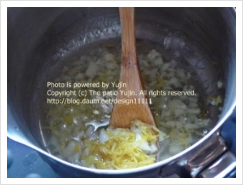 소스팬에 올리브 오일과 마늘을 넣고 익히다가 레몬 제스트(레몬 껍질 채썬것)을 넣고 더 익혀 레몬 오일(소스)를 만든다.